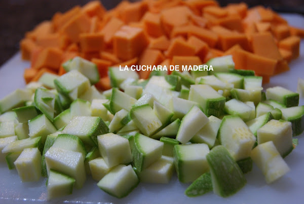 Lavamos y pelamos las zanahorias,las cortamos en trozos pequeños.Lavamos y cortamos los calabacinos.