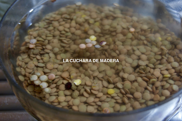Lo primero que vamos a hacer es poner las lentejas en agua para lavarlas y separar las que estén negras, las dejamos en agua mientras vamos pelando y picando las verduras.