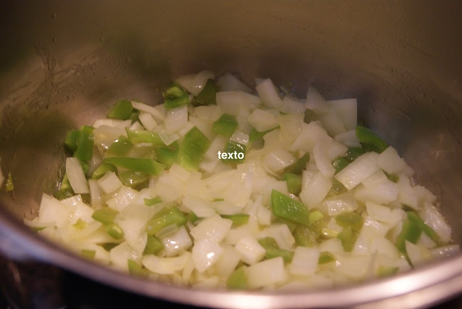 En la olla (o caldero) ponemos un poco de aceite, metemos el pimiento y la cebolla para que se pochen a fuego bajo.