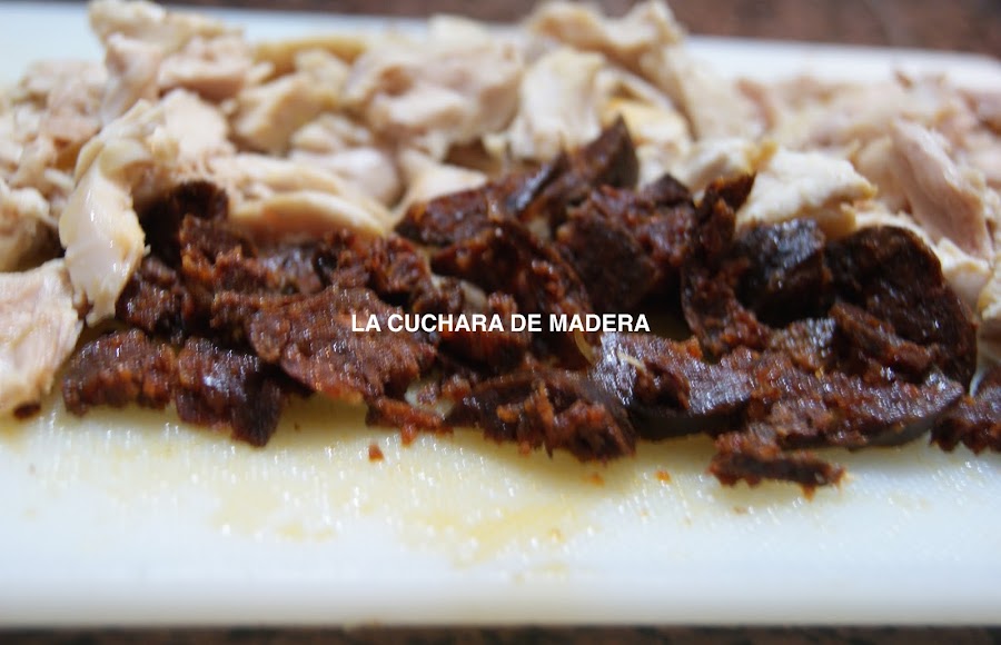 Ya cocinados el chorizo y el pollo, lo desmenuzamos y lo añadimos al potaje de lentejas