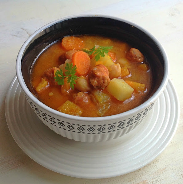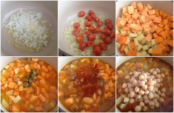 Pelamos, troceamos la cebolla y la ponemos a cocinar en una sartén a la que le hemos añadido el aceite. Cocinamos 2 minutos a fuego medio y agregamos las salchichas troceadas. Dejamos cocinar a fuego medio removiendo de vez en cuando para que no se pegue. Mientras pelamos la patata, la batata, la calabaza y la zanahoria, las troceamos e incorporamos a la cocción. Cubrimos con el litro de agua, ponemos la pastilla de caldo, añadimos pimienta, pimentón dulce y comino molido. Removemos bien, tapamos y uan vez que comienza a hervir, dejamos cocinar durante 20 minutos a fuego medio. Lavamos los garbanzos cocidos, los agregamos y cocinamos 5 minutos más.