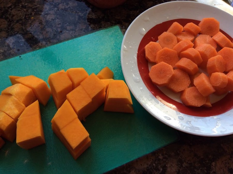 Mientras tanto, pelar la calabaza y la zanahoria y tocearlas.