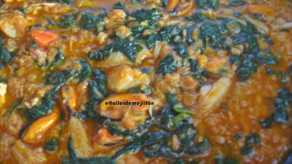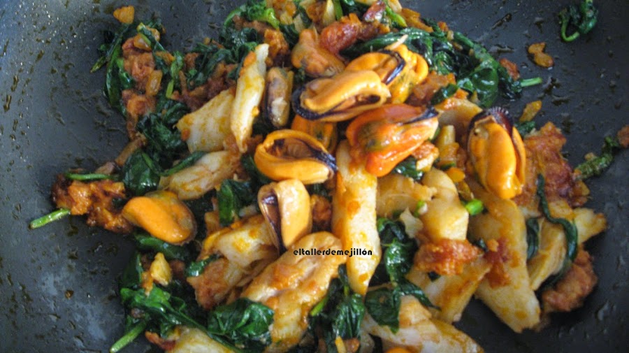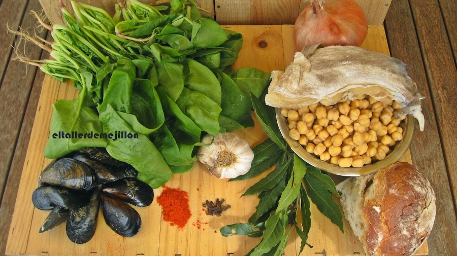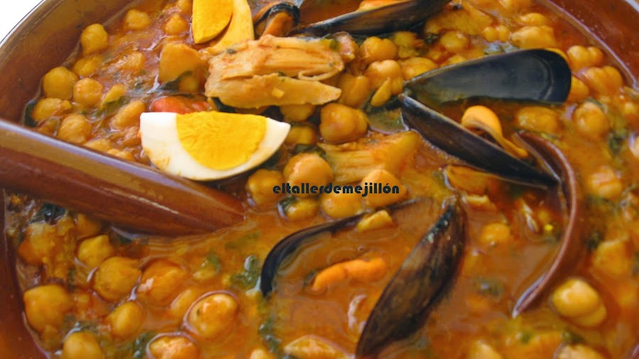 Mezclamos, añadimos la agua de cocción de los mejillones y de la cocción de los garbanzos y el bacalao. Este preparado lo agregamos a los garbanzos, teniendo mucho cuidado con la sal.