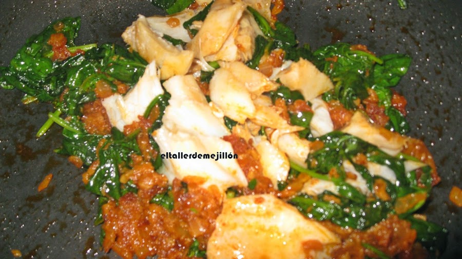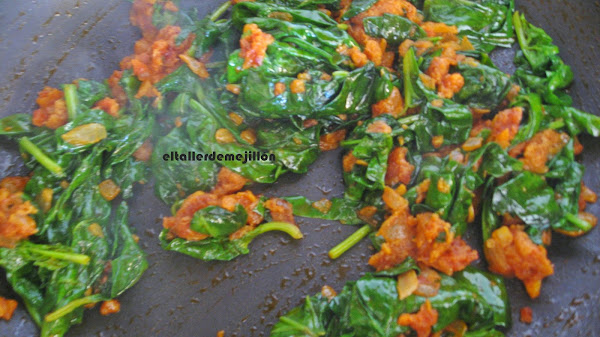 Removemos hasta que esté bien mezclado y añadimos las hojas de espinacas que hemos lavado previamente.