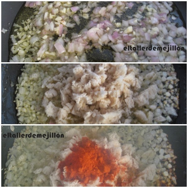 El sofrito lo prepararemos con la cebolla y los dientes de ajo y, cuando se dore, agregamos la miga de pan y el pimentón.