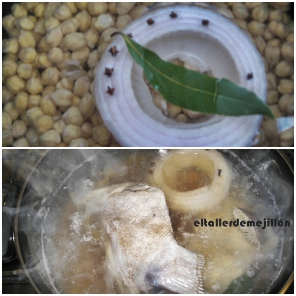 En una olla ponemos a cocer los garbanzos en agua fría, que hemos tenido durante doce horas en remojo, añadimos media cebolla donde hemos incrustado los clavos y, finalmente, una hoja de laurel. Lo dejamos cociendo durante 15 minutos y añadimos el bacalao desalado.