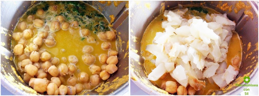 Añade el resto de garbanzos cocidos y el bacalao desmigado. Programa 8 MINUTOS /100º / GIRO DERECHA-IZQUIERDA / VELOCIDAD CUCHARA.