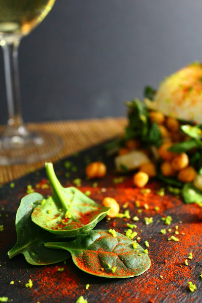 3.- Picamos grueso el bacalao ahumado y las espinacas, queremos trozos grandecitos y percibibles y en un cuenco (me sigo negando a decir "bol") mezclamos el bacalao, los garbanzos y las espinacas mientras aliñamos con aceite, sal, vinagre y la mitad del pimentón ahumado (dulce o picante o mejor, mitad y mitad) que vayamos a utilizar.