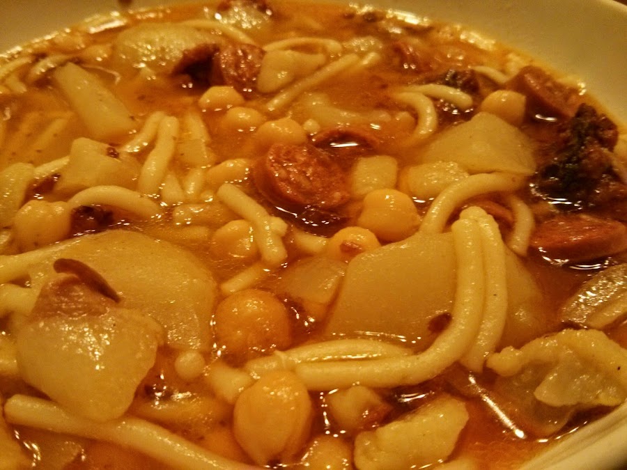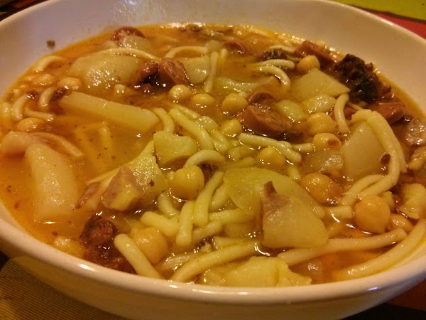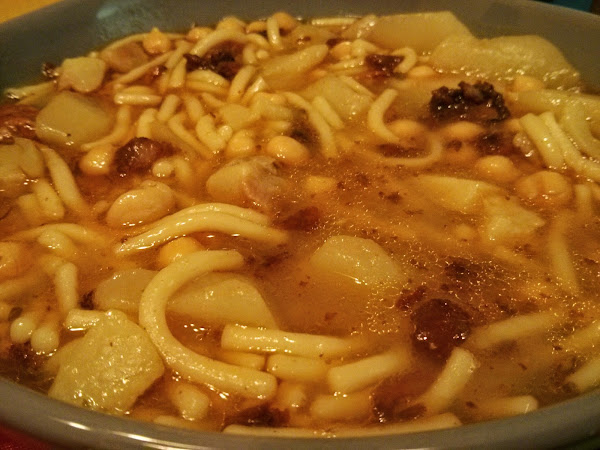 - Cuando rompa a hervir añadir los fideos y las patatas y cocer 15/20 minutos