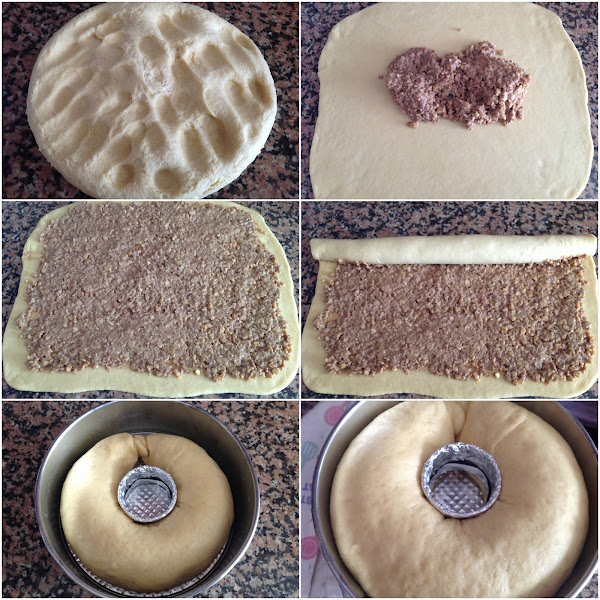Volcamos la masa en la encimera y aplastamos un poco con los dedos para eliminar el gas que se genera con el leudado. Estiramos con rodillo dejándola de 0.5 cm de espesor y dándole forma rectangular. Distribuimos por encima el relleno, enrollamos y formamos una corona. Engrasamos con mantequilla un molde de 22 cm de diámetro y colocamos allí la corona, dejando que leude durante 30 minutos. Como no tengo un molde con agujero en el centro, le puse un cortante redondo envuelto en papel metalizado, apto para cocinar, para evitar que se cierre el centro de la rosca.