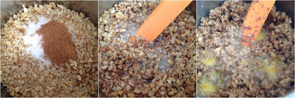 Trituramos las nueces y añadimos el azúcar y la canela en polvo. Agregamos la leche templada y la miel caliente, removiendo bien. Dejamos enfriar e incorporamos el huevo batido. Reservamos.