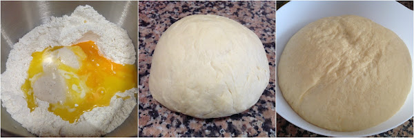 Ponemos en un bol la harina restante junto con la sal y el azúcar, mezclando bien. Añadimos el prefermento, la mantequilla derretida y el huevo batido. Comenzamos a mezclar e incorporamos la leche restante. Amasamos hasta obtener una masa suave que no se pega a los dedos, la colocamos dentro de un bol, cubrimos con papel film o bolsa de plástico y dejamos descansar en un lugar cálido, hasta que doble su volúmen. Yo la he dejado dentro del horno apagado, durante 2 horas.