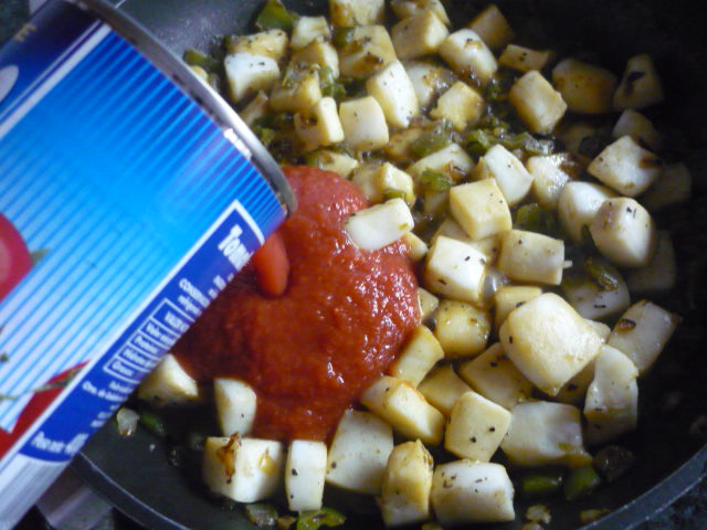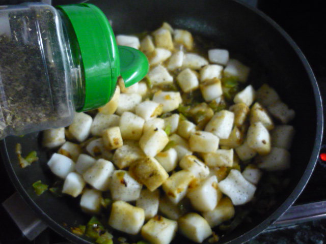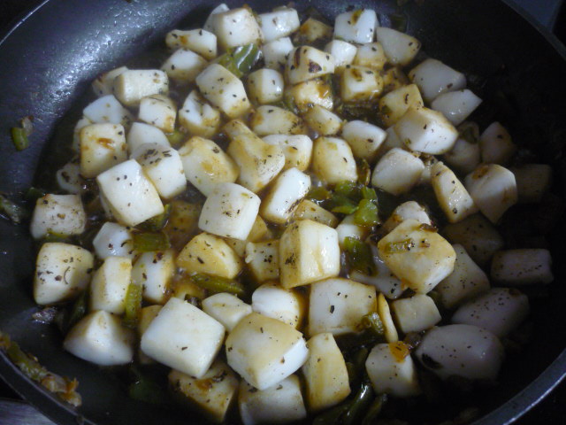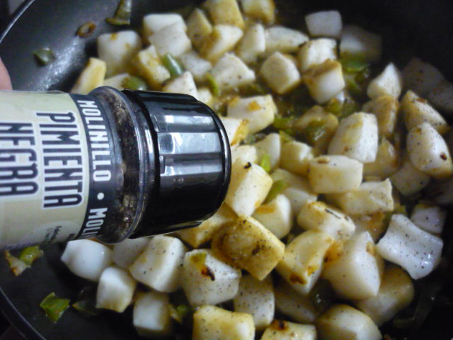 3.- Cuando el sofrito esté en su punto, agregamos los dados de potón, la pimienta y la albahaca y mezclamos todo.