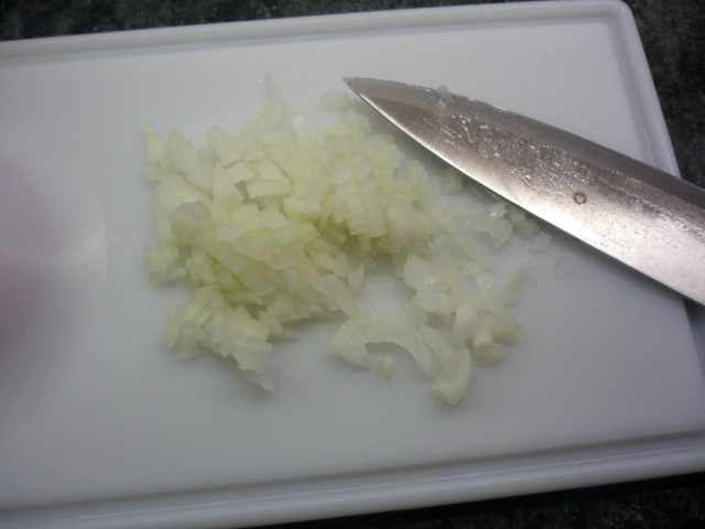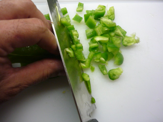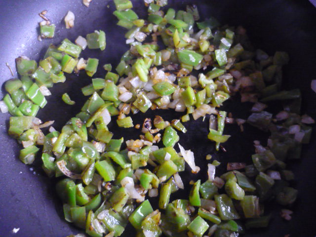 1.- Picamos la cebolla y los pimientos y los pochamos en una sartén con el aceite de Oliva.