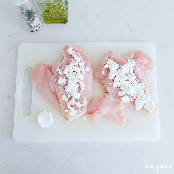 Fais chauffer le four à 200ºC. Coupe les escalopes de poulet par le milieu, dans lépaisseur, pour faire une poche. Remplis ces poches avec le fromage de chèvre.