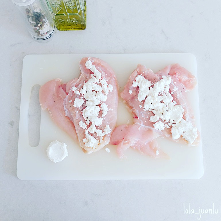 Desmenuzamos los rulos de queso de cabra para que sea más fácil rellenar las pechugas de pollo que hemos preparado.