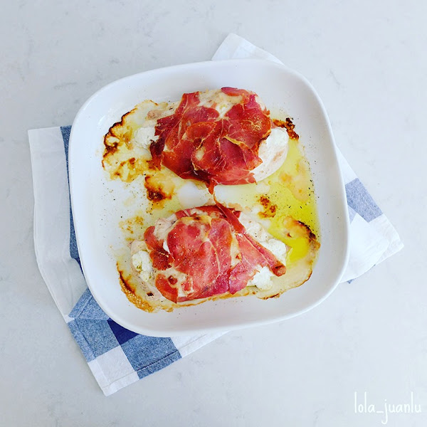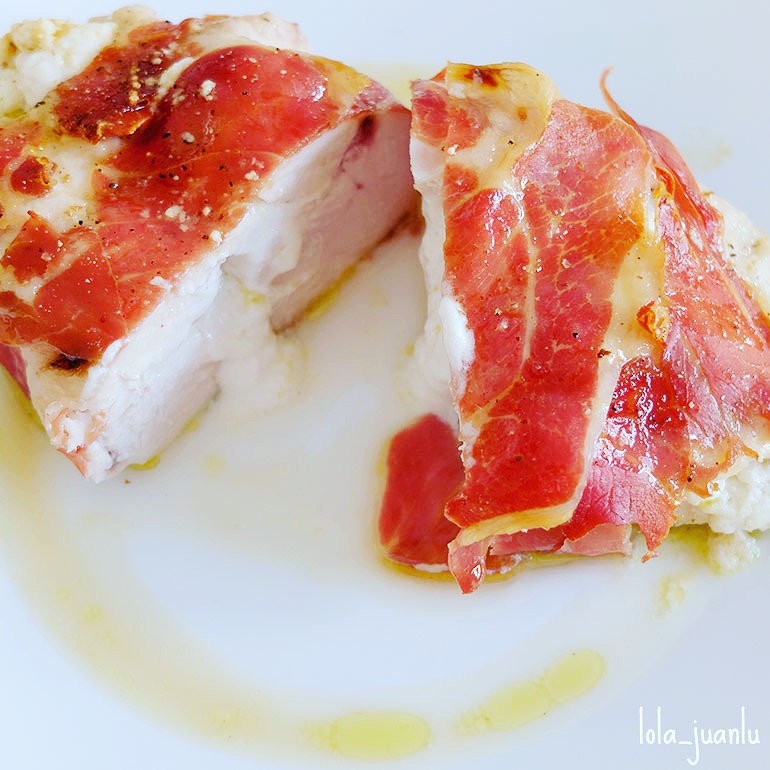 Una vez hemos rellenado las pechugas de pollo con el queso de cabra, las envolvemos con las lonchas de jamón.