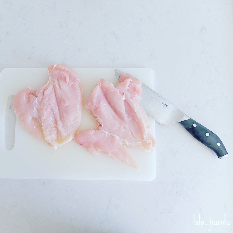 Limpiamos las pechugas de pollo, aunque si os la prepara el carnicero mejor. A continuación le hacemos un corte en medio para poderlas rellenar. Salpimentamos.