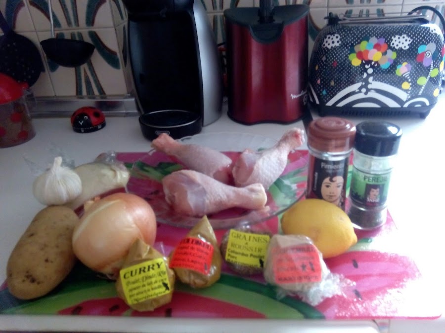 - 1 cucharadita de café de baies para el Colombo, otra de curry, otra de jengibre y otra de orégano.