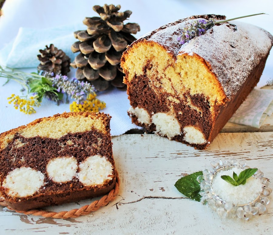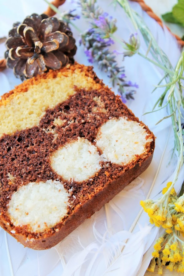 La verdad es que la vida en casa nos ha cambiado muchísimo desde que mi hijo supero su alergia al huevo. Muy a menudo me acuerdo de los inicios del blog inspirados en las recetas sin huevo para ayudar a otros padres a modificar las recetas de toda la vida e adaptarlas para los alérgicos al huevo y sus familias. Una de estas recetas que tanto gusto en su día y tengo pendiente de repetir pero con huevo es la que os traigo hoy. A parte de las bolitas de coco tenemos un esponjosísimo y rico bizcocho de yogur bicolor. Lo he llamado pound cake ya que era lo mas parecido a lo que llega a ser un pound cake pero para mi siguen siendo un "pastel con sorpresa" "modificado". Si lo hacemos en molde rectangular conseguiríamos el mismo efecto que el original. Ingredientes: (intentando que todos sean a temperatura ambiental)