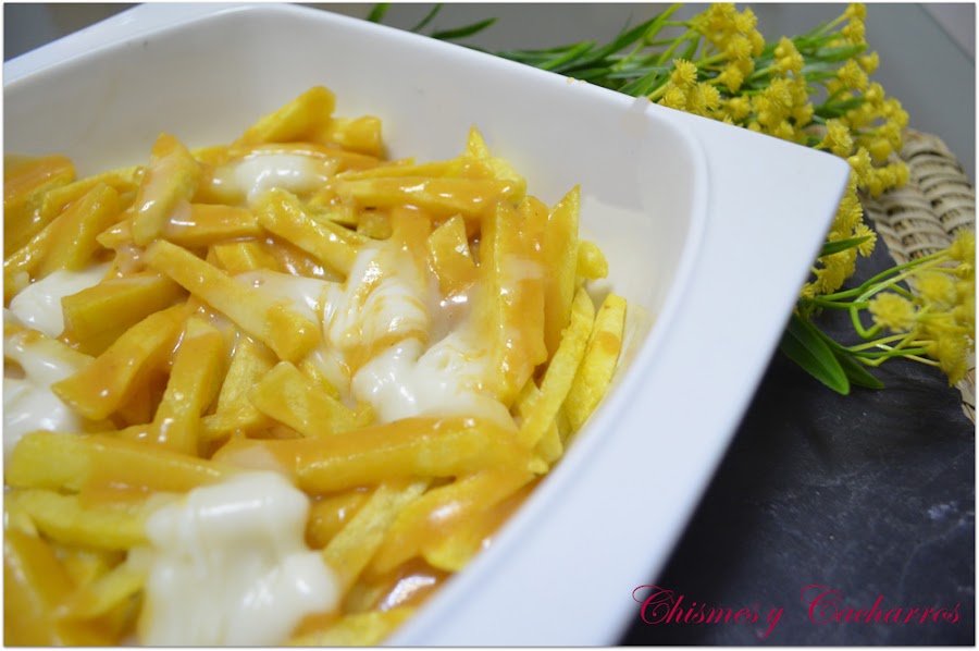 Pelar y cortar las patatas en bastones y freír en abundante aceite muy caliente. Una vez fritas sacar a una fuente con papel de cocina para quitar el exceso de aceite. Colocar en la fuente para servir, poner unas cuantas cucharaditas de queso repartido por todas las patatas, calentar la salsa (muy caliente) verter por encima y servir al momento.
