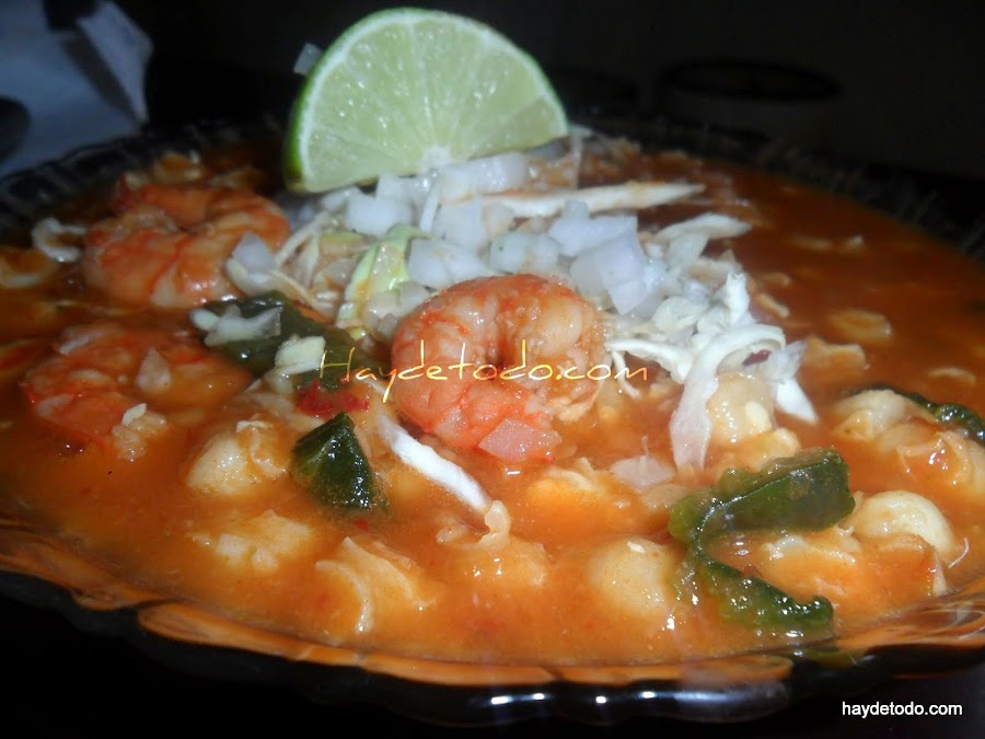 Vaciamos ésta mezcla a la olla con el maíz, después agregamos los pimientos verdes y dejamos hervir unos veinte minutos; transcurrido ese tiempo le vaciamos los camarones y el epazote, hervimos por otros 10 minutos más, y rectificamos sazón.