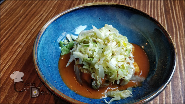 "Rape con marinera de curry y repollo de Betanzos". Rape terso y jugoso acompañado de una marinera suave con un toque de curry y coronado con el repollo salteado crujiente. Un plato muy redondo y que estaba muy buena la mezcla de todos los ingredientes.