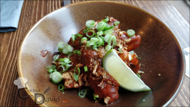 "Alitas infierno". Ya el nombre te avisa de que son unas alitas canallas y picantes, están coronadas con cebolleta, cebolla frita y un gajo de lima que le aporta ese acidez que le viene muy bien. Unas alitas picantes y adictivas con una salsa tipo Buffalo. Muy buenas.