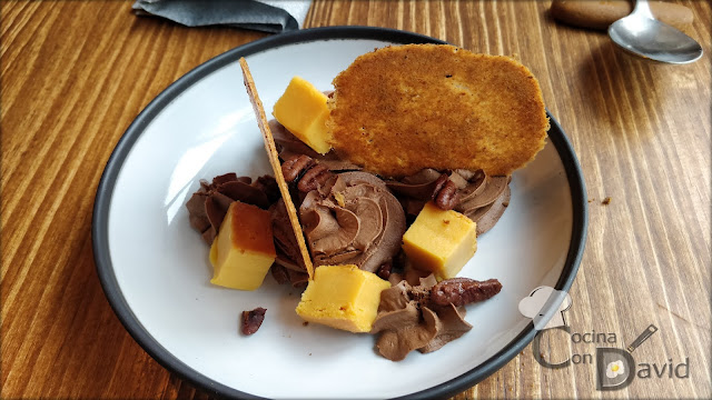 "Calabaza y chocolate". Encontramos dados de pastel de calabaza muy ligero y cremoso, mousse de chocolate, nueces garrapiñadas y crujiente. Un postre chocolatero que está muy bueno.