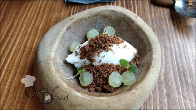 "Manzana con curry crumble & yogur". Una base de natillas de manzana, helado de yogur búlgaro, crumble de cacao y curry y dados de manzana gran smith. Un postre muy refrescante, con matices diferentes y muy rico.