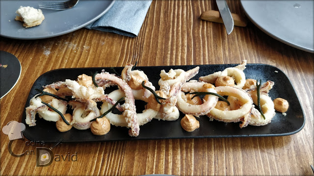"Calamar frito con alioli de tomate seco". Un calamar fresco frito a la andaluza, muy ligero y crujiente acompañado de botones de alioli de tomate seco que le viene muy bien y salicornias que le aporta ese sabor marino tan característico.