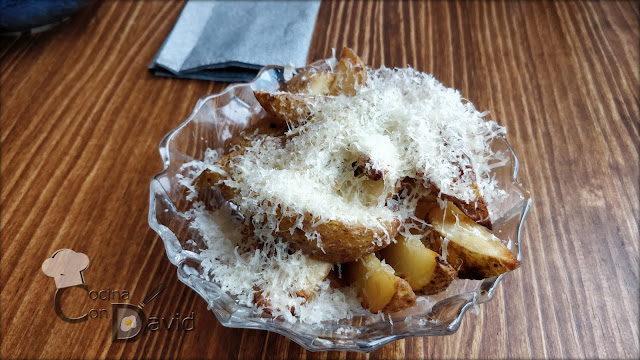 "Gajos de patata + Arzúa". Como acompañante de la costilla nos decidimos por las patatas gajo con piel crujientes por fuera y cremosas por dentro, coronadas con queso arzúa rallado. Buenísima la mezcla de ambas cosas.