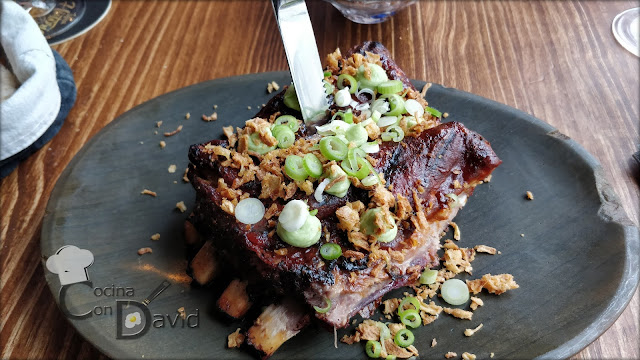"Costilla Bbq". Una costilla bbq muy jugosa y sabrosa que se deshace con el mismo tenedor separándose fácilmente la carne del hueso. Caramelizada y con ese toque dulce, coronada con cebolla frita y cebolleta verde. Muy buena.