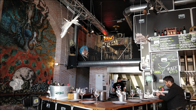 El entrar nos encontramos con un local diferente y canalla con temática musical, una barra en el centro en forma de "u" a modo de escenario donde te cocinan en directo, a la derecha mesas bajas y un comedor pequeño en la parte de arriba.