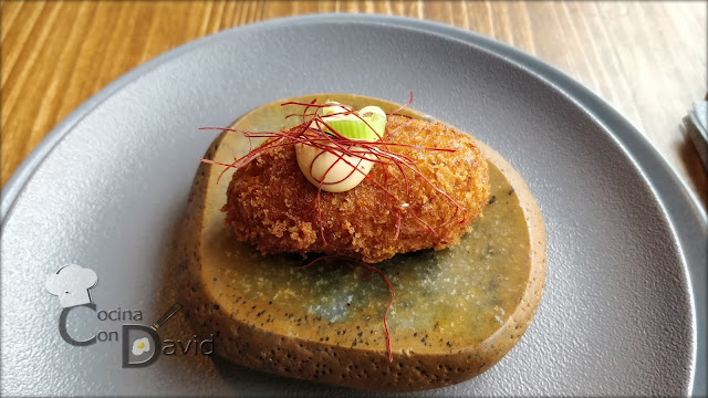 "Croqueta de Centolla". Croqueta de centolla crujiente por fuera y cremosa por dentro, coronada con salsa chilli picantita, brotes de chile y cebolleta. Se sirve por unidad. Buenísima.