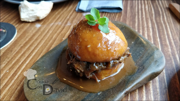 "Brioche relleno de rabo estofado". Se trata de un brioche relleno de rabo estofado y desmenuzado regado todo ello por la salsa del mismo rabo aportando jugosidad y mucho sabor al conjunto. Muy bueno.