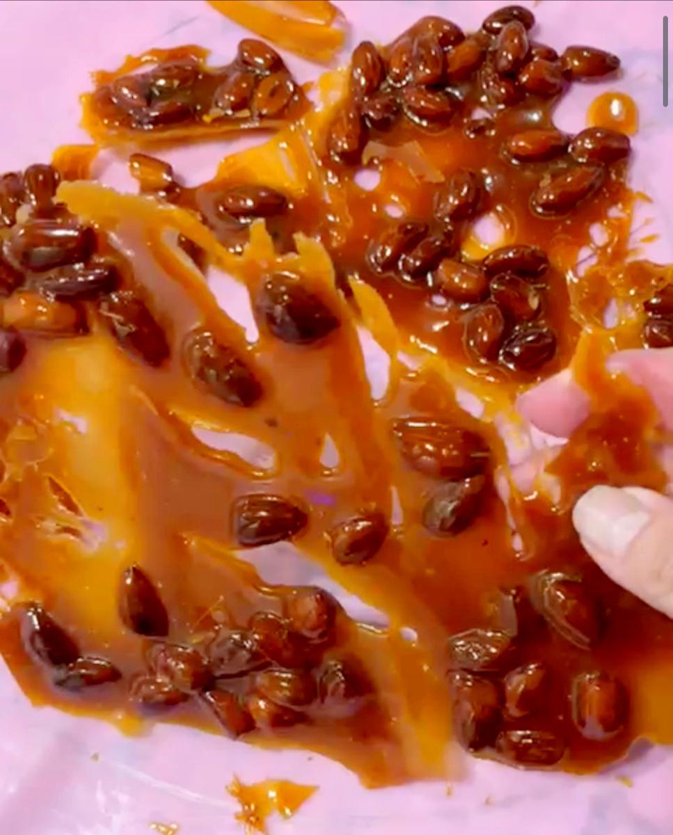 3-Incorpora las almendras, peladas y tostadas, Cómo pelar y tostar almendras, mezcla rápidamente con cuchara de madera o de silicona y deja que tome color caramelo