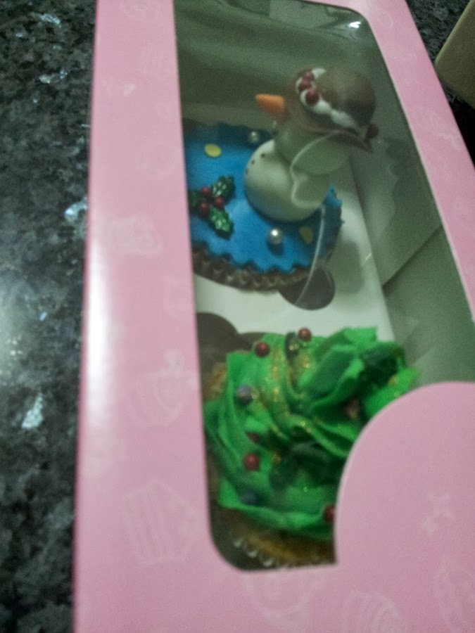 Estos son los dos cupcakes que hicimos, mi árbol de navidad y mi muñeco de nieve, luego me hicieron dos regalos uno es la cajita para llevarme los cupcakes y otro cajita con una corona para guardar el Roscón de Reyes que preparé para ese día.