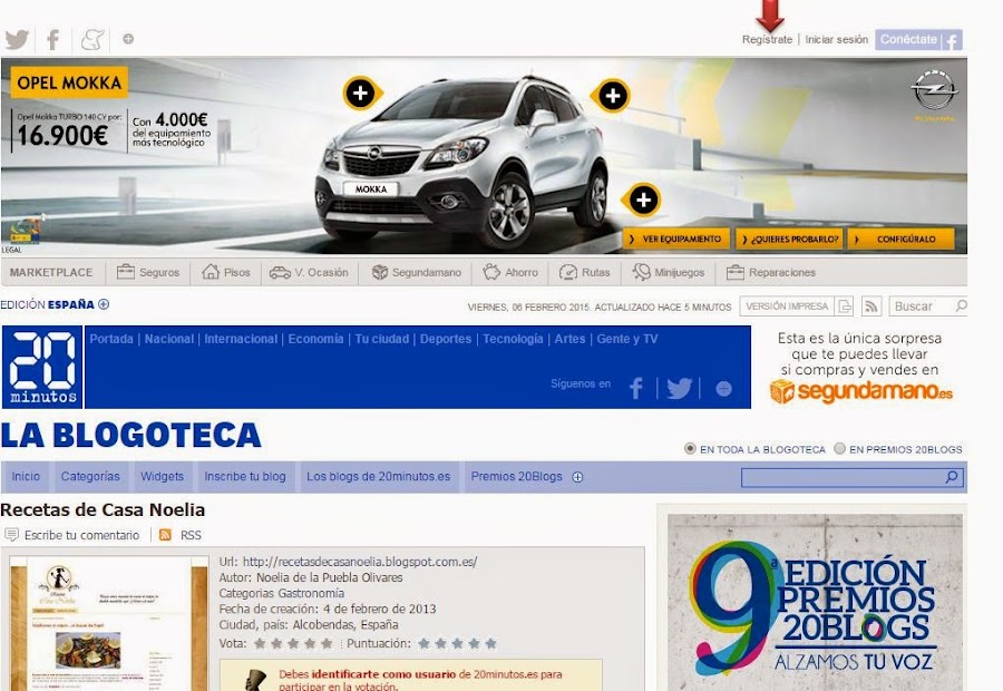Es necesario registrarse en 20 minutos para poder votar al blog, para ello tienes que darle al botón de registrar.