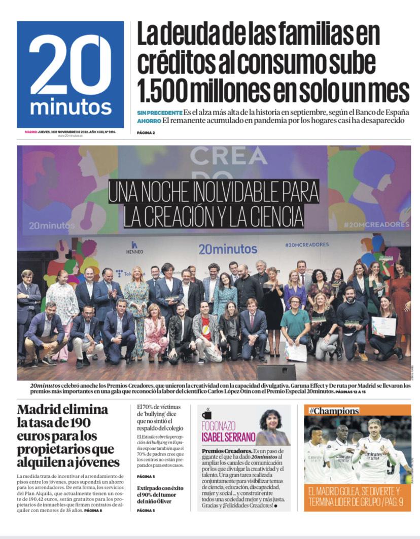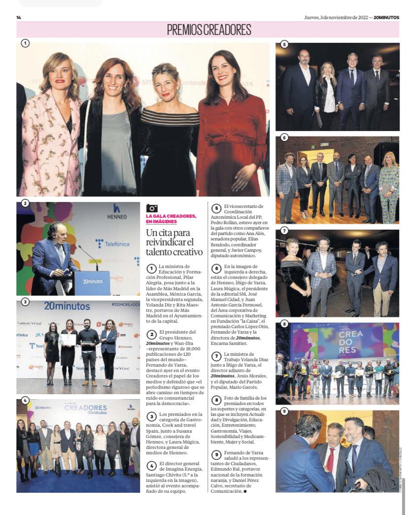 Hoy tenemos una gran noticia que contaros. Y es que 20 minutos celebró el 02 de Noviembre del 2022 la gala de los Premios Creadores 20 m, en Caixa Forum, Madrid, de los cuales éramos finalistas tras 2 años consecutivos en la categoría gastronomía.