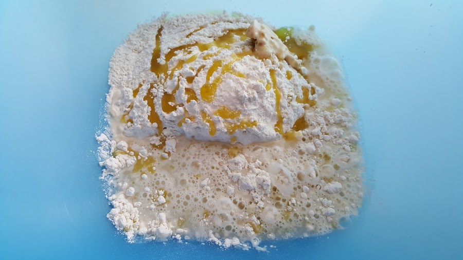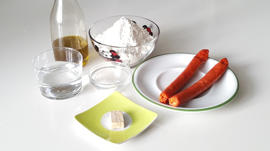 1. - Encendemos el horno a 50º (para acortar el tiempo de fermentación de la masa). Ponemos en un bol todos los ingredientes, excepto la chistorra, y removemos con una cuchara hasta que podamos manejar la masa con las manos.