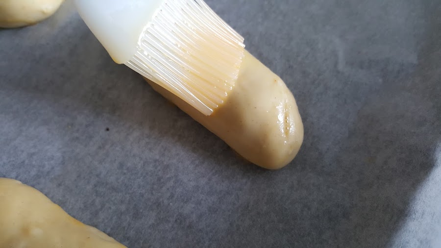 7. - Sacamos del horno y lo subimos a 200º. Y mientras, batimos un huevo y vamos pincelando los bollitos.