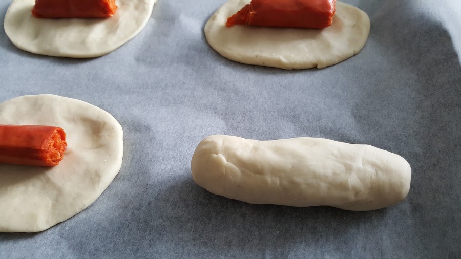 5. - Cortamos la chistorra del tamaño que más nos guste y vamos colocando un trozo en cada porción de masa.
