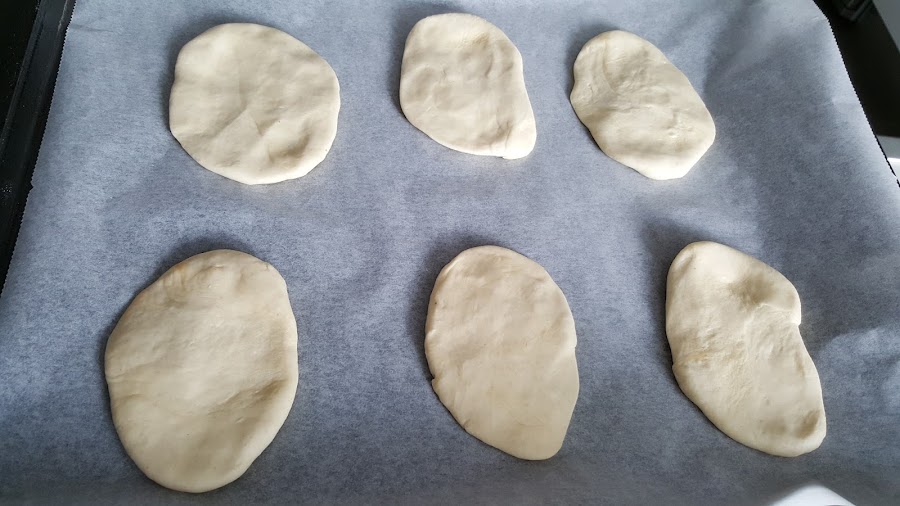 4. - Cada porción de masa la extendemos con las manos y las vamos colocando en una fuente de horno con papel de hornear.