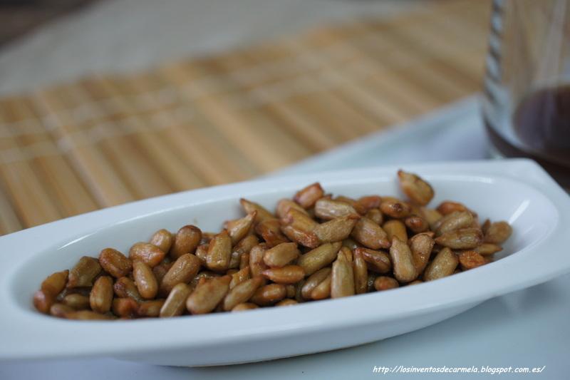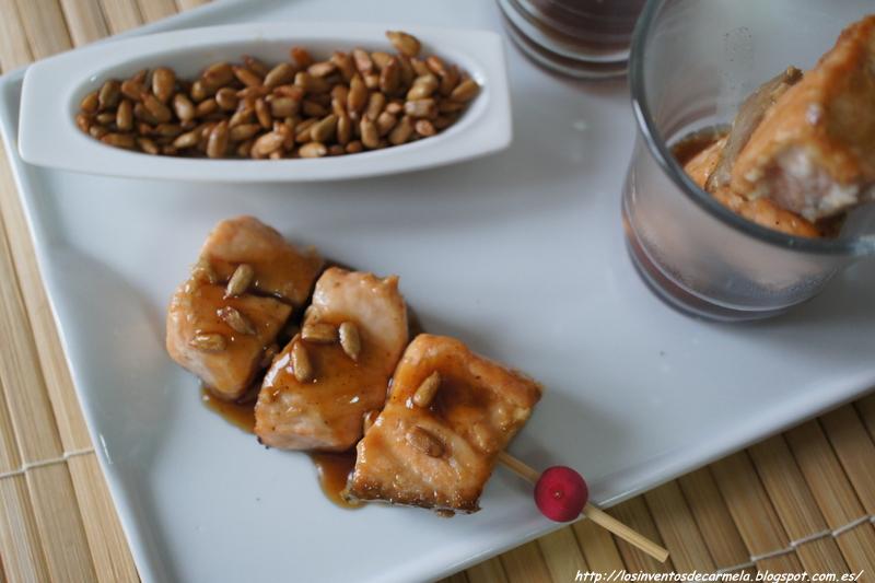 Para acompañar esta exótica brocheta había elegido copos de cebolla crujiente que ya no es difícil de conseguir en cualquier tienda, le da un toque muy bueno a la brocheta ya que el salmón es un pescado que combina muy bien con el sabor de la cebolla frita, perooooooooo en el caos de mi despensa no los he encontrado así que me he atrevido a probar las brochetas con estas semillas de girasol caramelizadas, y mira tú, que me ha encantado el contraste jeje, Carmela total !!