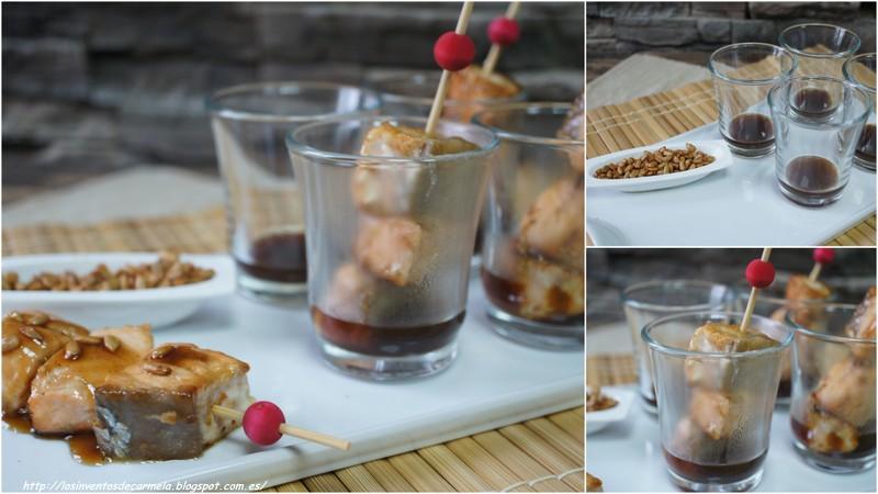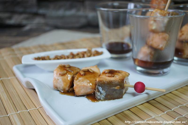 BROCHETA DE SALMÓN TERIYAKI CON PIPAS CARAMELIZADAS