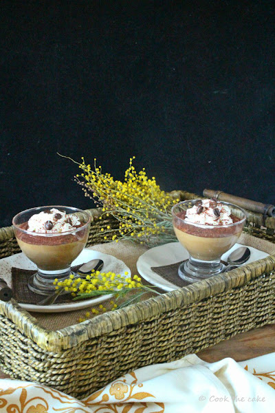 En un principio, en vez de una crema, pensé en hacer una panna cotta y disponerla en capas (una capa de vainilla, otra de chocolate...). Seguramente hubiera quedado más vistosa, pero de lo que se trataba era de dar una especial relevancia al café, por eso al final descarté esta idea.
