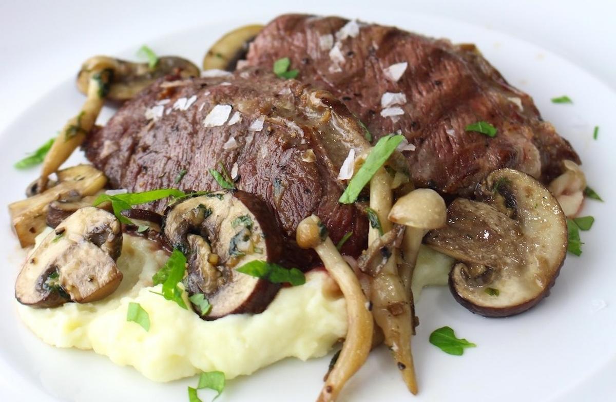Presa ibérica de cerdo asado a la plancha con un puré de patata suave o parmentier y setas salteadas