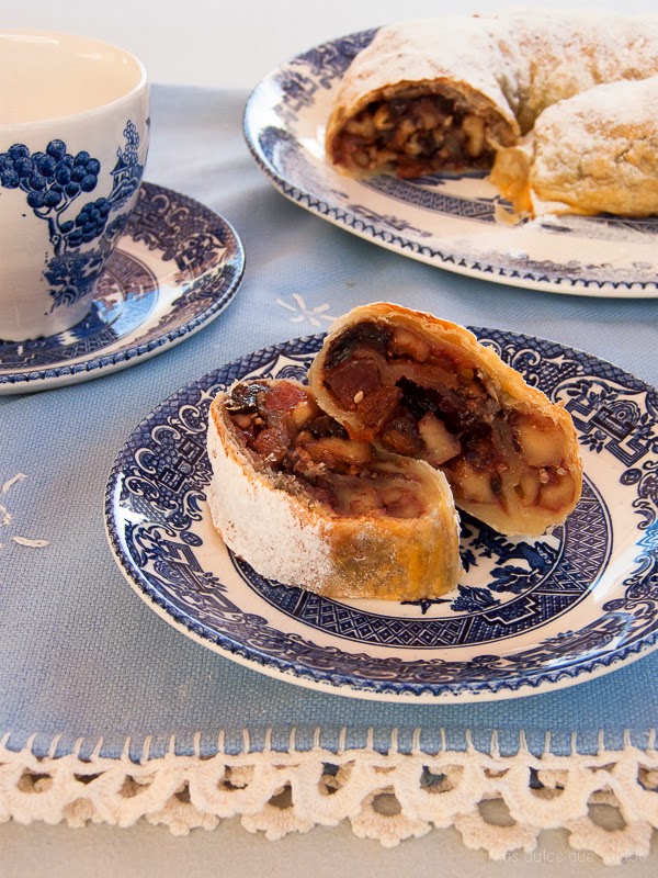 El relleno de frutos secos es un poco al gusto, yo le he puesto los que tenía en casa. También se le puede añadir higos secos, orejones, ciruelas pasas..... El tipo de fruta confitada también va al gusto de cada uno. Además yo le he añadido unas semillas de sésamo caramelizadas que le han dado un punto dulce y crujiente delicioso.