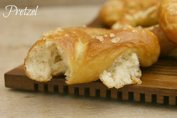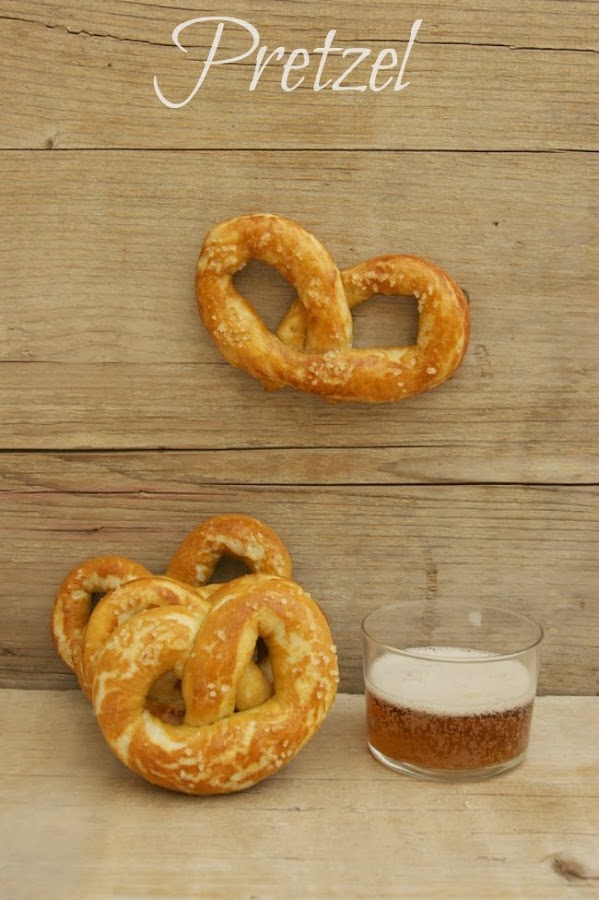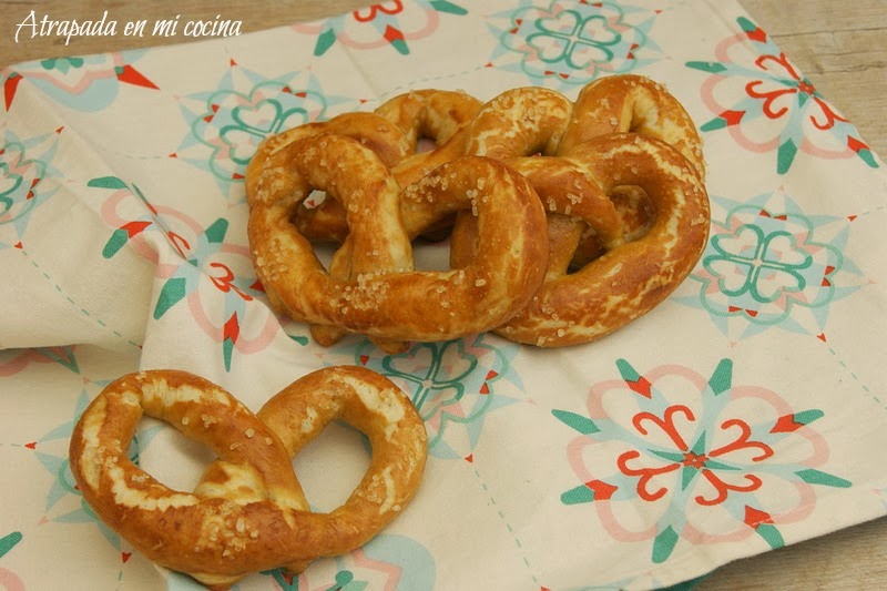 Los Pretzel son un tipo de galleta o bollo horneados y que toman forma de lazo retorcido. Su origen se encuentra en Alemania, y es bastante popular tambien en Alsacia, América del Norte y Australia. Su nombre proviene de la palabra alemana Brezel o Breze, derivada del latín bracellus, "brazo pequeño". Este nombre se debe a que su forma recuerda a dos brazos entrelazados. En Alemania y especialmente en Baviera, lugar de su nacimiento, el pretzel es muy diferente al de Estados Unidos. Forma parte de la comida típica del país y es un tipo de pan salado. Básicamente existen dos categorías: los pretzels de galleta y los pretzels de pan blando. El segundo tipo se puede preparar con una gran variedad de sabores, que incluyen almendra, ajo, etc. Sus ingredientes principales suelen ser: harina de trigo con levadura, leche y mantequilla; la masa se sumerge brevemente en una solución de hidróxido de sodio (soda cáustica) o bicarbonato de sodio al 3% antes de hornear,como lo oís, y este baño es el que le da ese sabor tan particular y ese crujiente. De hecho en el centro de Europa es común la tecnica de sumergir los panes en liquidos. Pues bien, ésta es la propuesta de este mes para el reto Bake the world, yo ya tengo publicada una receta de ellos, aunque se me cerraron al hornear, y tampoco los sumergí en bicarbonato. Por lo que no contenta con aquella versión me embarqué en hacer la de Mai, de Hierbas y Especias, y algo más contenta que la primera vez he quedado, pero no del todo con la forma, que para mi es lo más difícil de conseguir de los pretzel. Menos mal que me subió la moral la prima de mi marido alemana, que está pasando unos días aquí y los probó y le gustaron mucho, y las niñas se comieron dos seguidos, lo que es señal de que si que se parecen a los verdaderos.